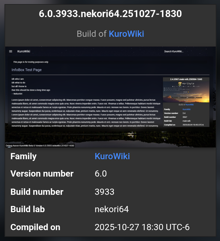 Currently upstream Deltari/KuroWiki supports the build type of infobox, which is usually used on versions of projects that use a versioning scheme similar to KuroWiki’s. An example is shown here: